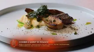 - Na talerzu ułóż porcję purée z ziemniaków, a obok połóż delikatnie usmażoną polędwiczkę z sarny. Całość polej czekoladowym sosem. Obok ułóż chipsy z jarmużu oraz podsmażone grzyby. Danie można udekorować świeżymi ziołami.