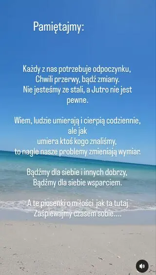 Pamiętajmy: każdy z nas potrzebuje odpoczynku, chwili przerwy, bądź zmiany. Nie jesteśmy ze stali, a jutro nie jest pewne. Wiem, ludzie umierają i cierpią codziennie, ale jak umiera ktoś, kogo znaliśmy, to nagle nasze problemy zmieniają wymiar. Bądźmy dla siebie i innych dobrzy, bądźmy dla siebie wsparciem. A te piosenki o miłości jak ta tutaj, zaśpiewajmy czasem sobie....- napisała.